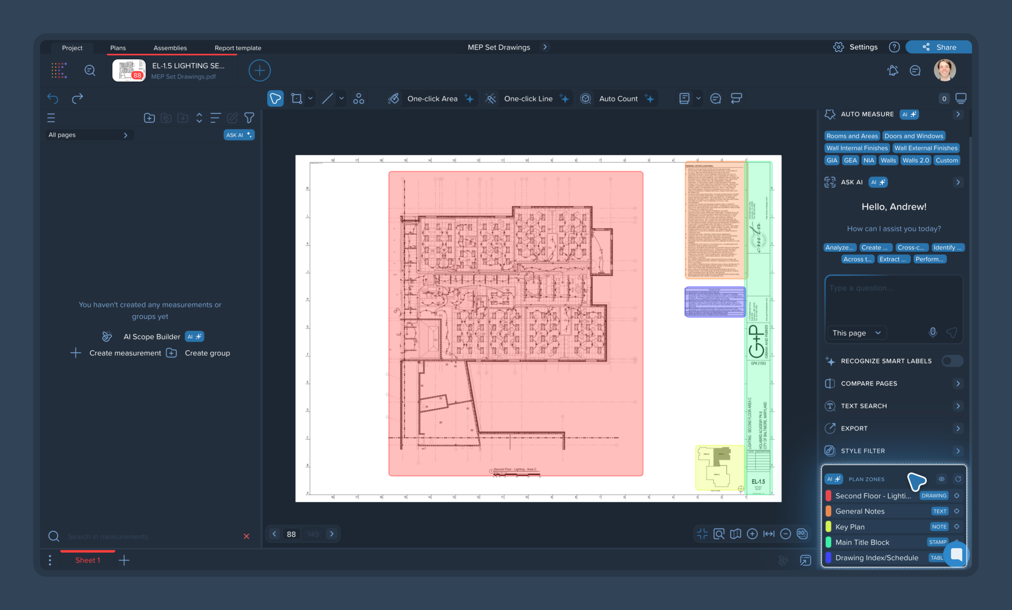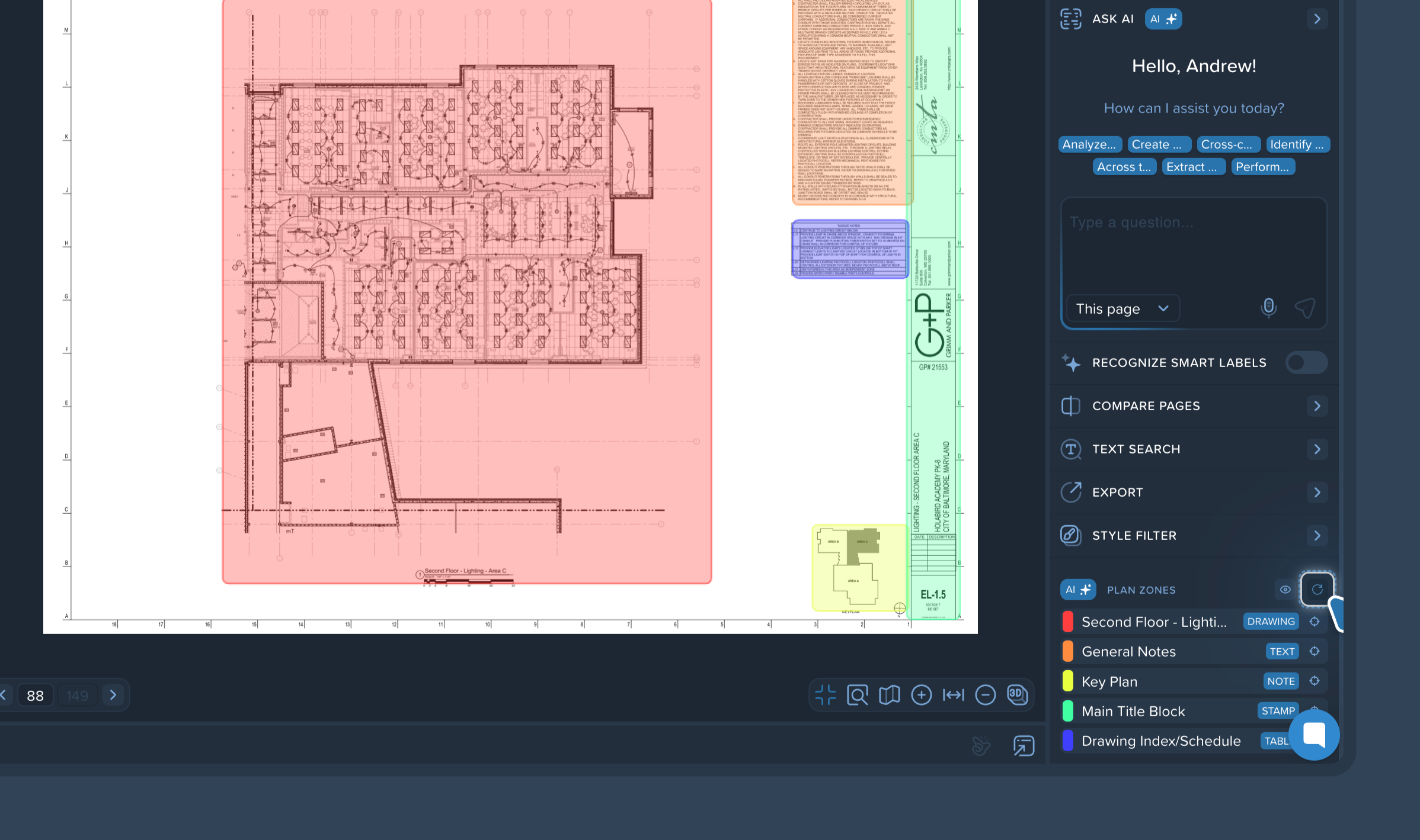 Plan Zones is an AI-powered feature that automatically recognizes and highlights key areas on your drawings. This not only simplifies document navigation but also helps other AI tools better understand the drawing's context for more accurate data extraction.
