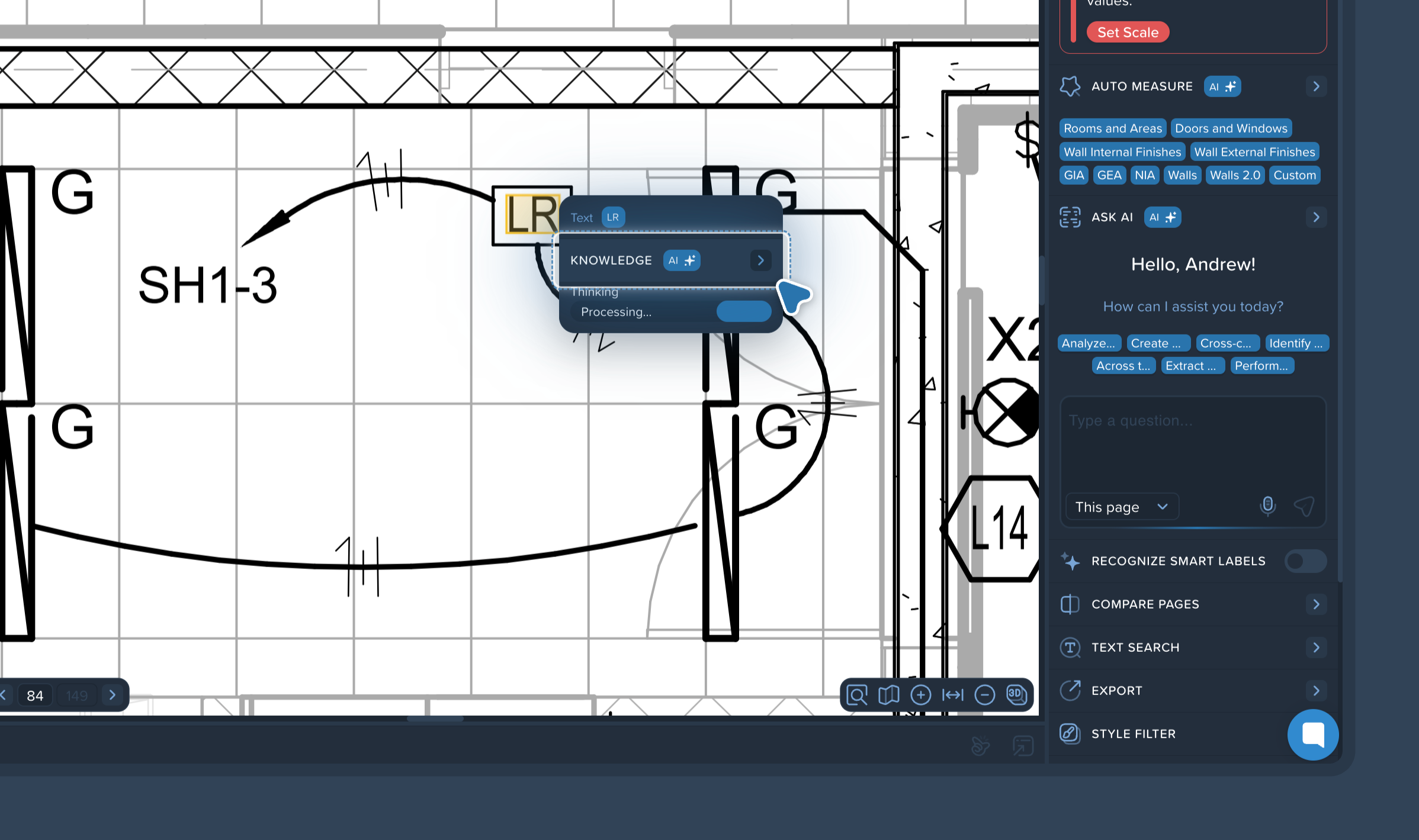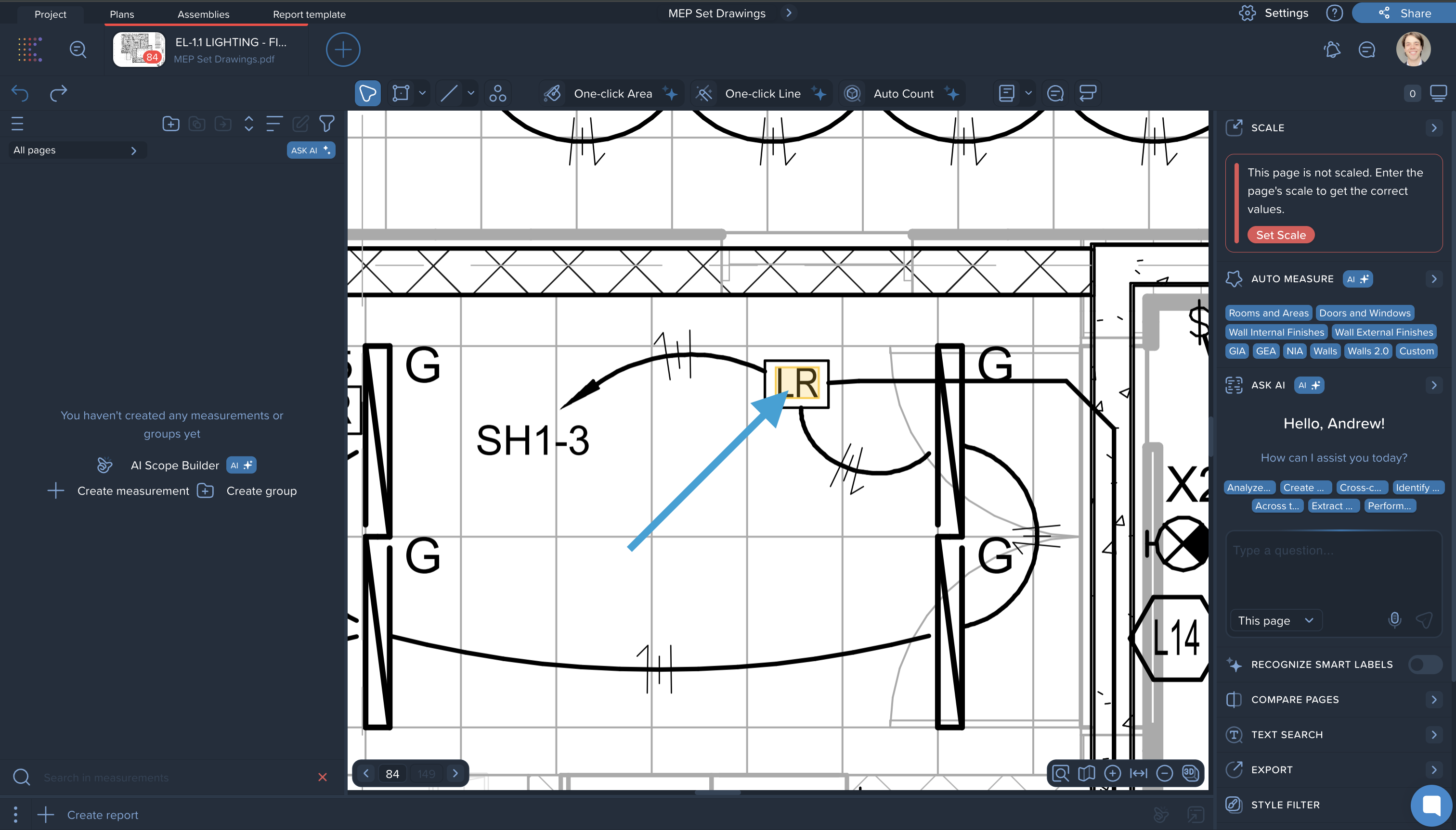 The Cross Reference feature is a powerful AI tool designed to save you time when navigating complex drawings. You no longer need to manually search through legends or schedules to figure out what a specific label means. The AI automatically connects text labels on the floor plan to their definitions, allowing you to instantly view the relevant information and even generate automated counts directly from the label.