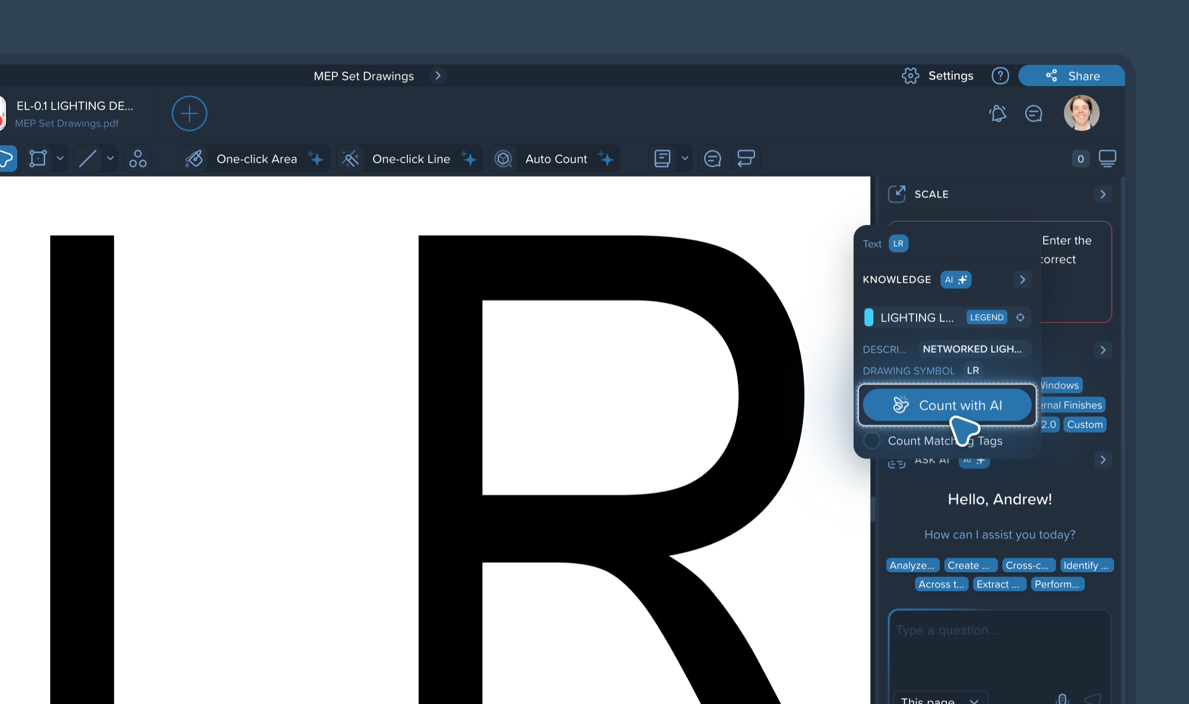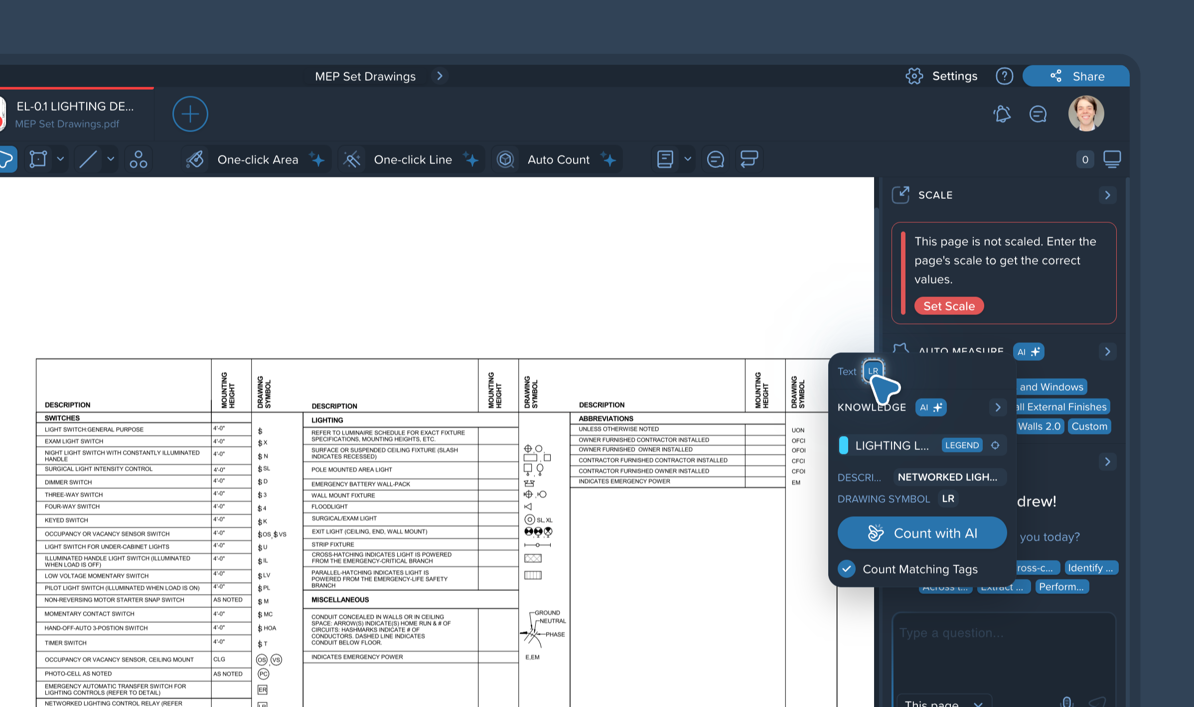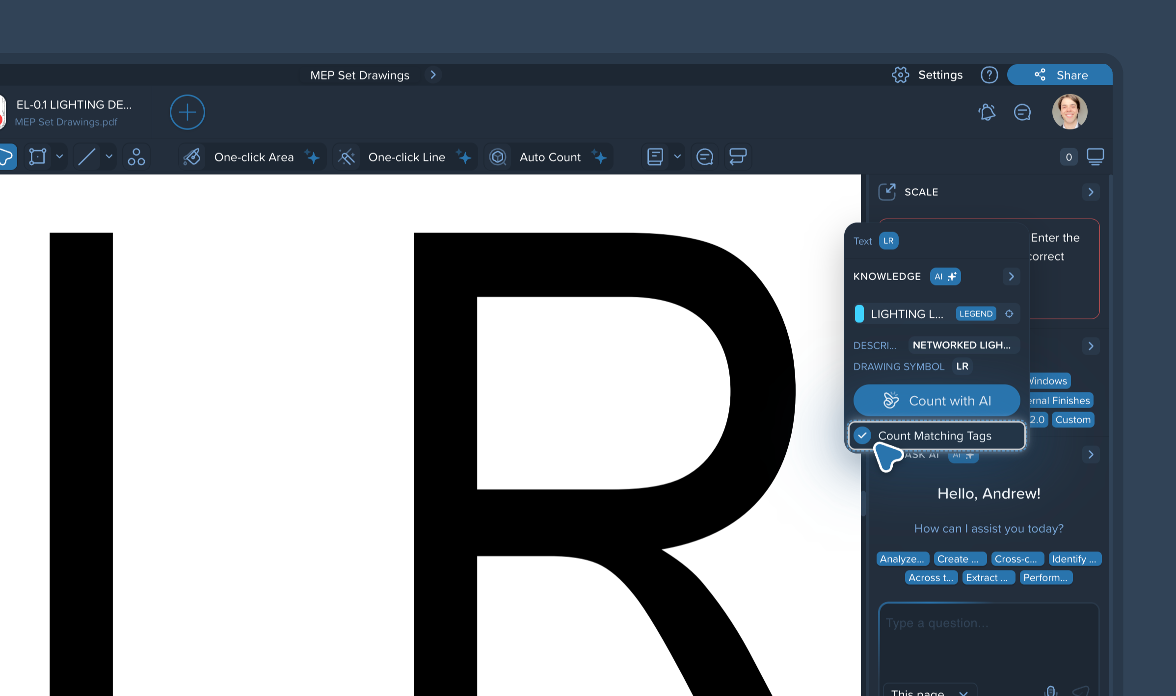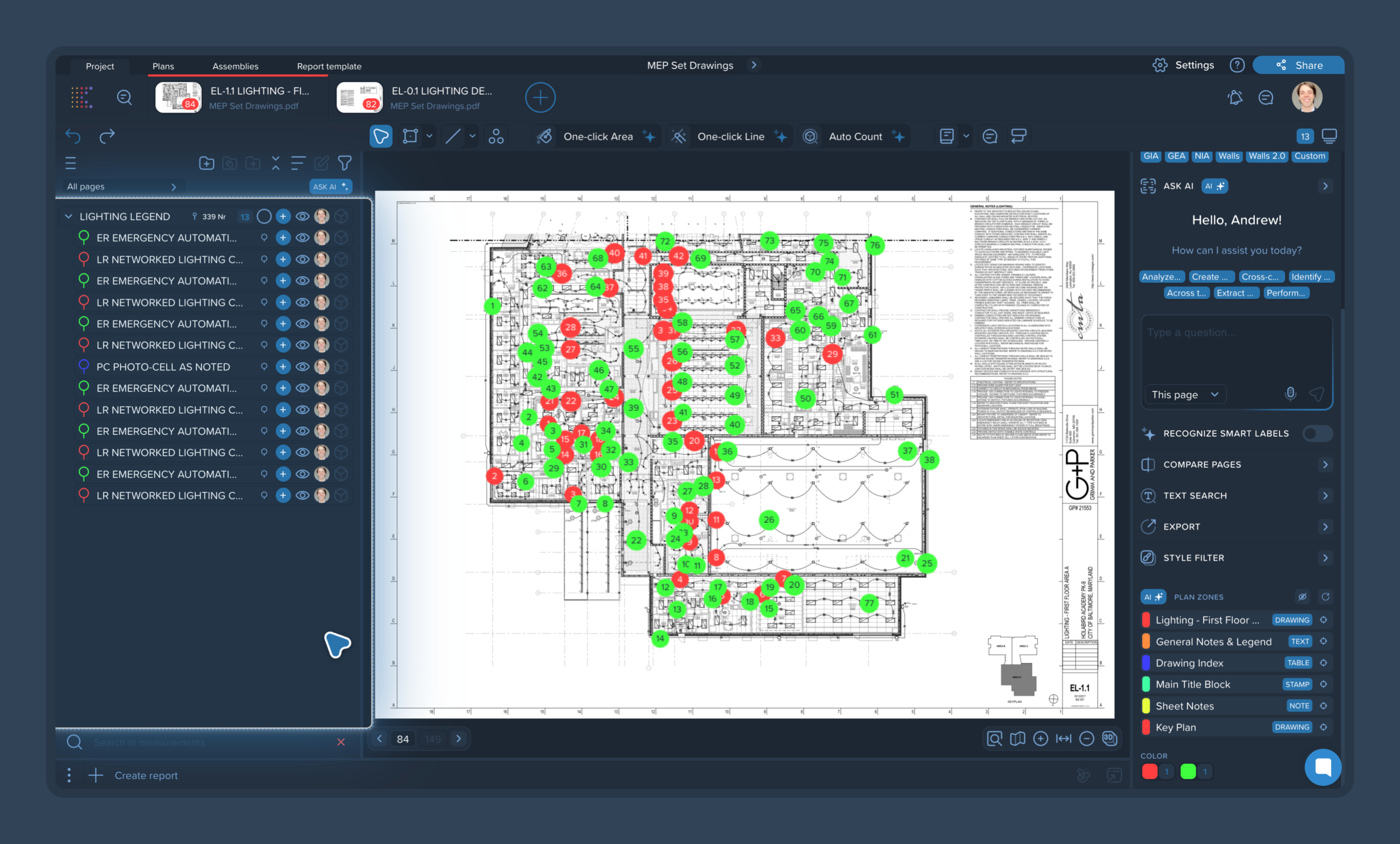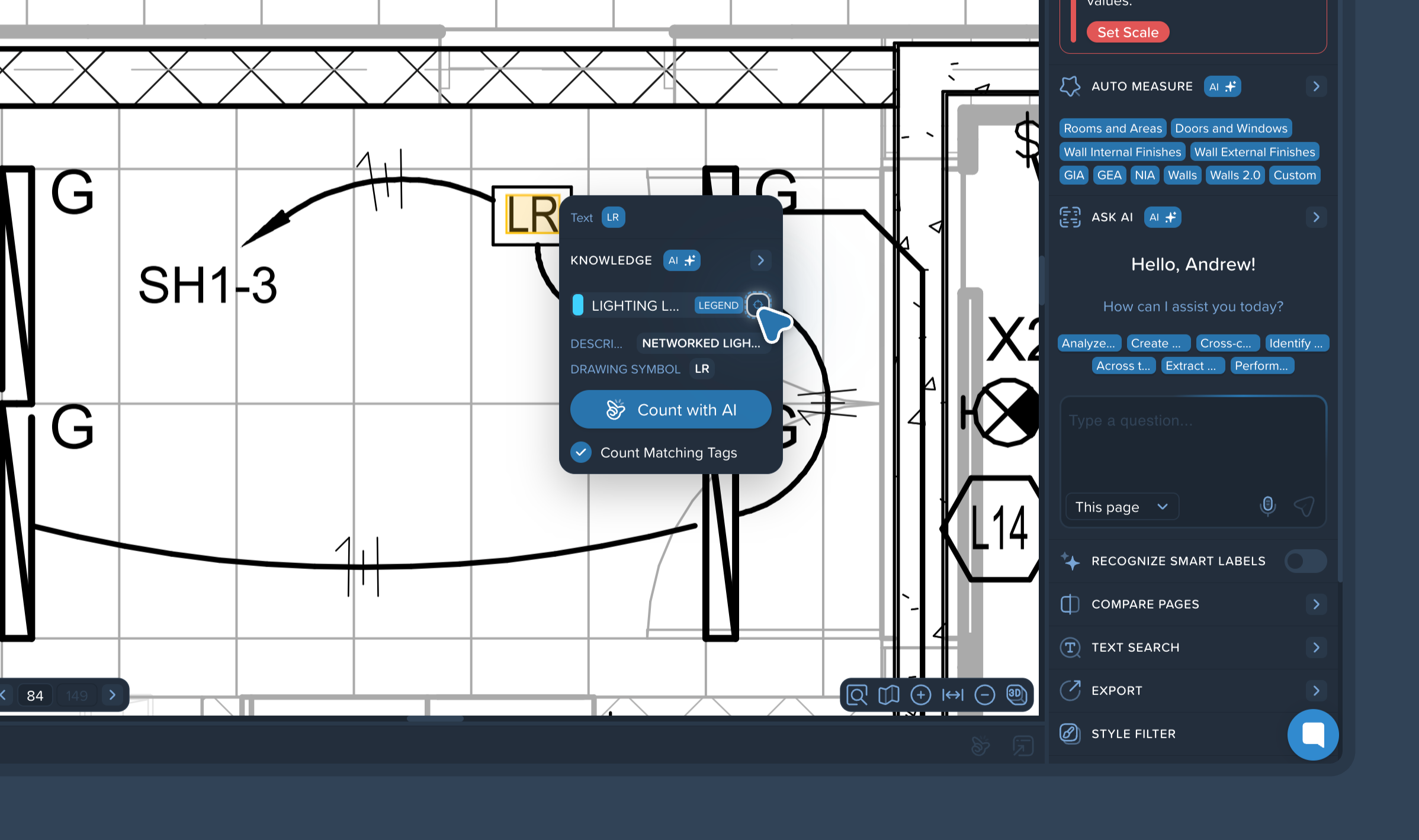 Pro Tip: Check the Count Matching Tags box before clicking the count button. This allows the AI to not only find the specific label you clicked but also identify and count all other associated items defined within that same legend, automatically generating a comprehensive breakdown in your left-side panel.