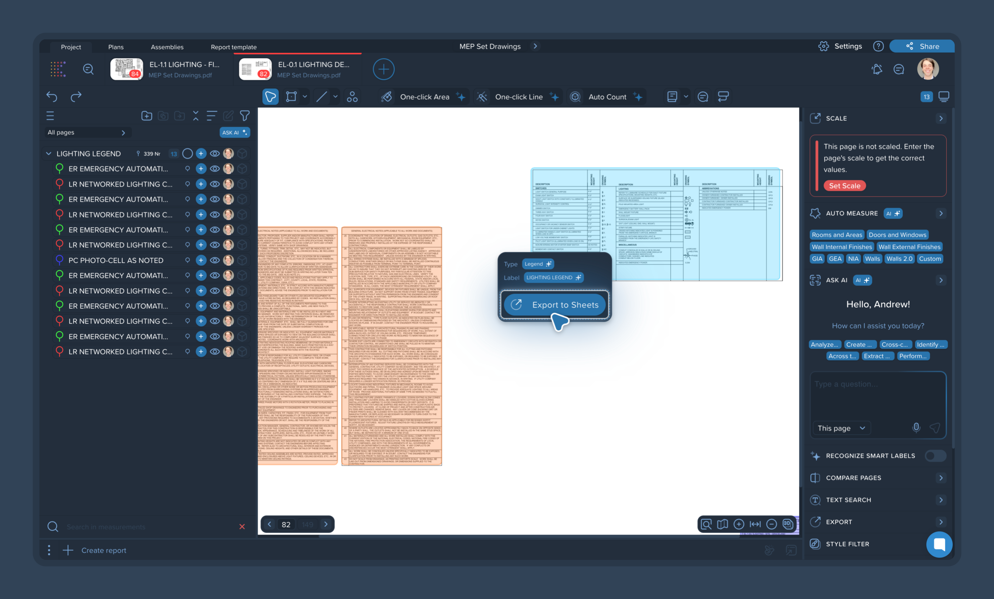 Make sure ‘Plan zones’ is ‘ON’, and click directly on a legend or schedule on your drawing, the AI Knowledge pop-up will appear with an Export to Sheets button.