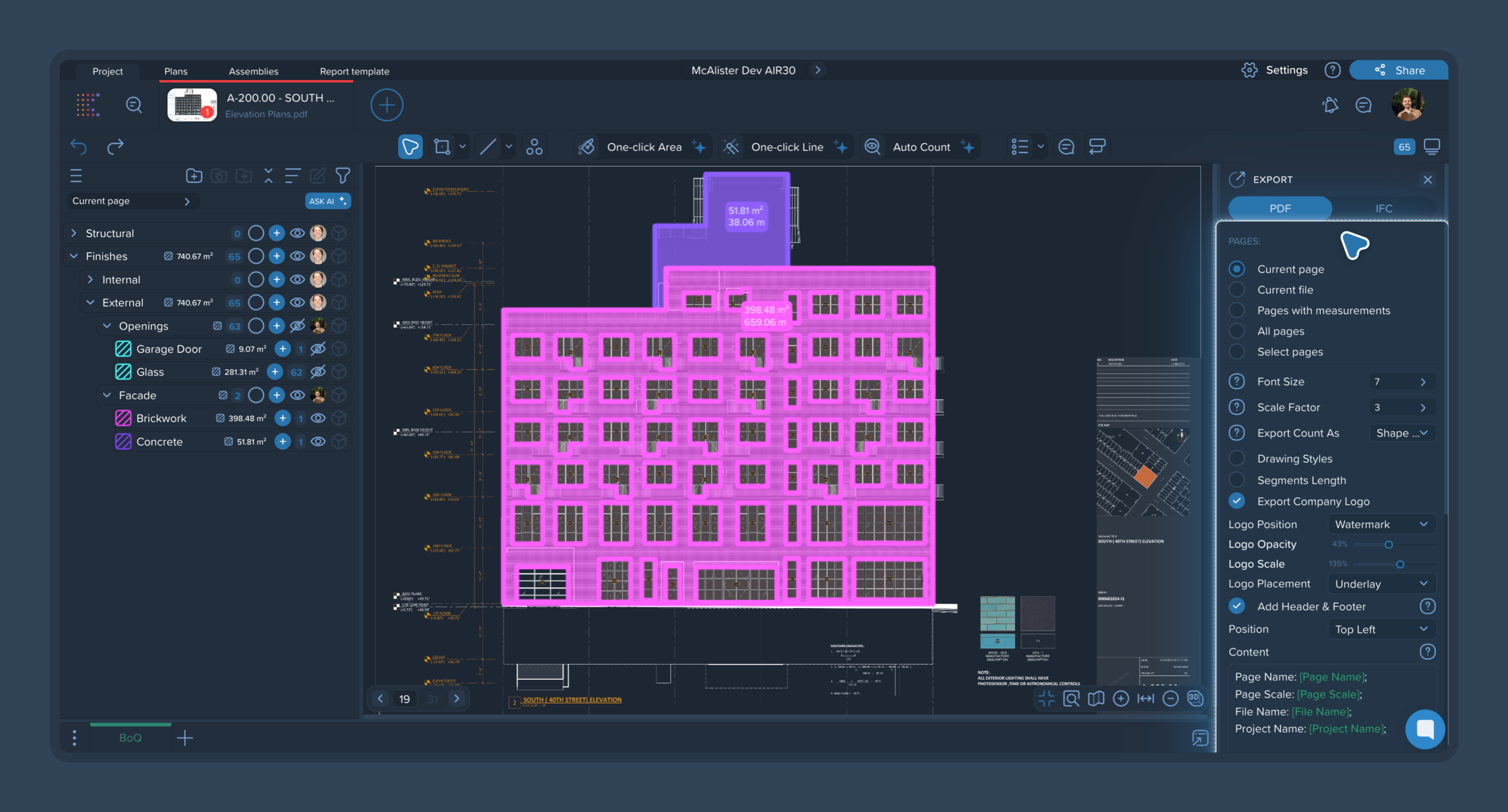 Company Logo Export: allows you to include your company logo directly in the exported PDF. You can fully control how the logo appears: Logo Position (top left, bottom right, watermark, etc), Logo Opacity, Logo Scale, Logo Placement (underlay/overlay).