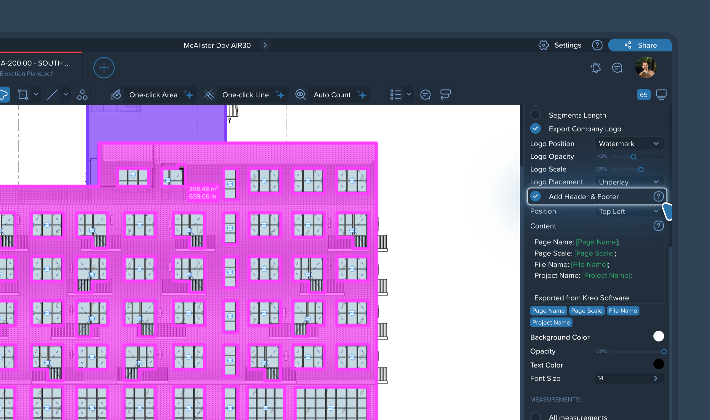 The Add Header & Footer option lets you place a small info block on your exported pages (PDF) with key project metadata such as Page Name, Page Scale, File Name, and Project Name.