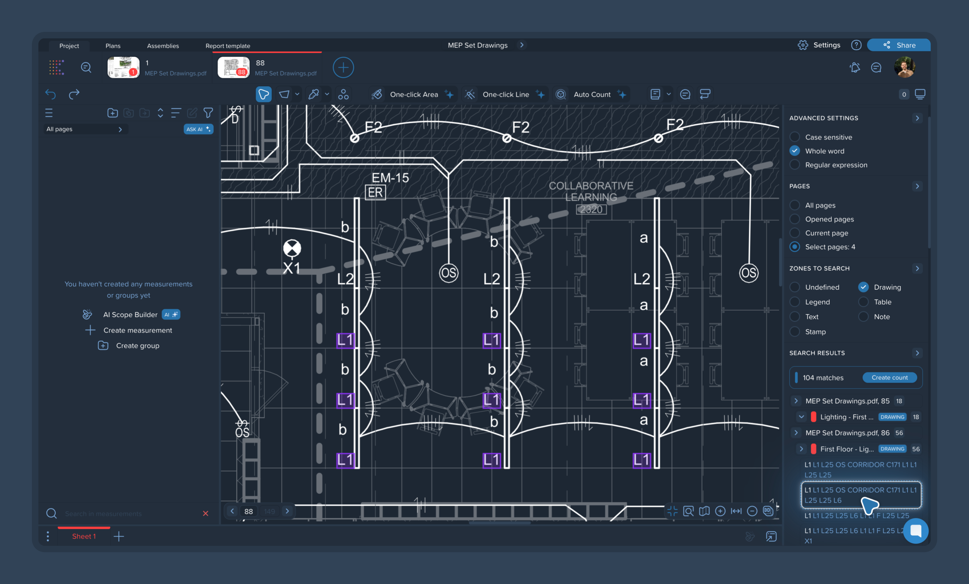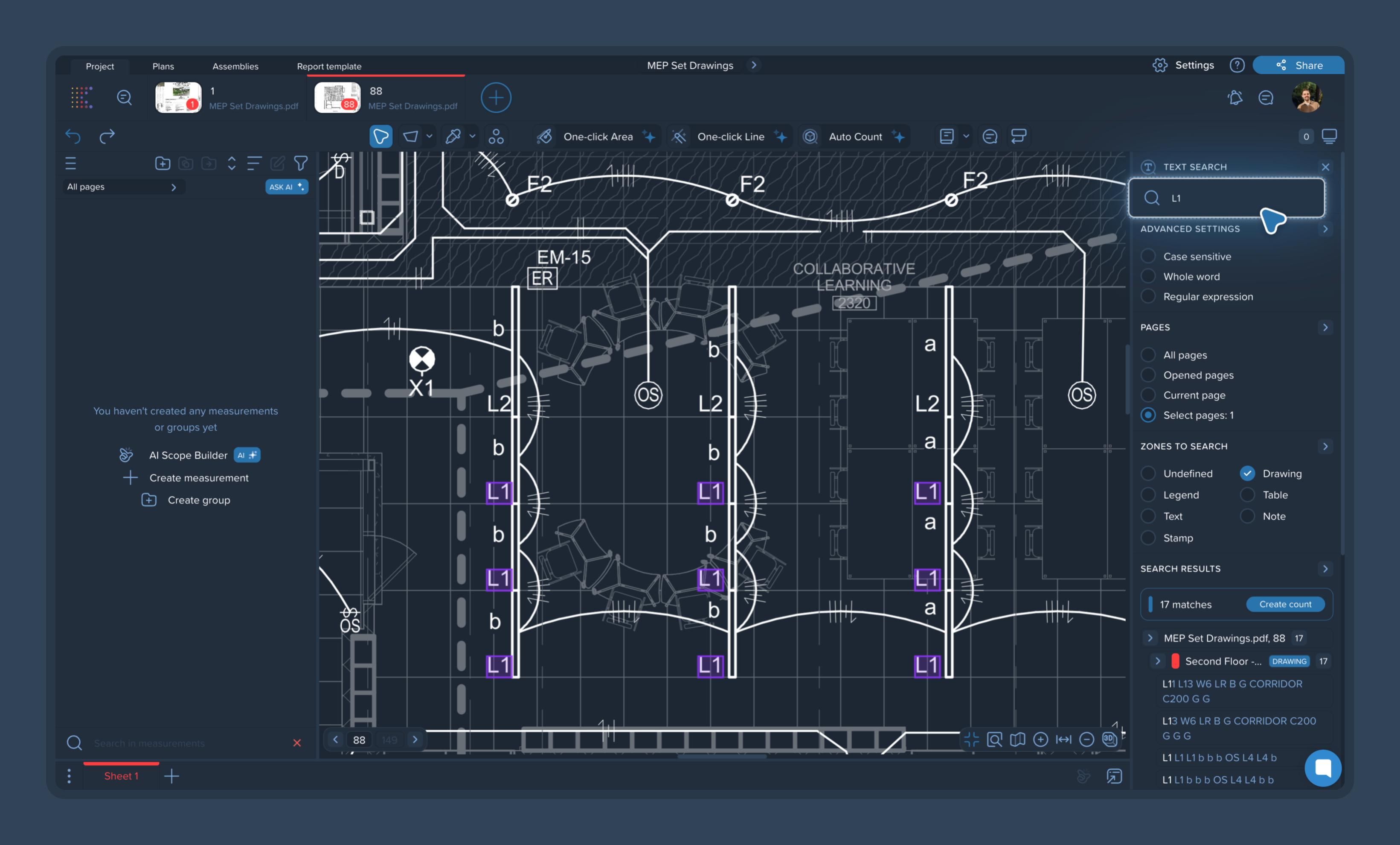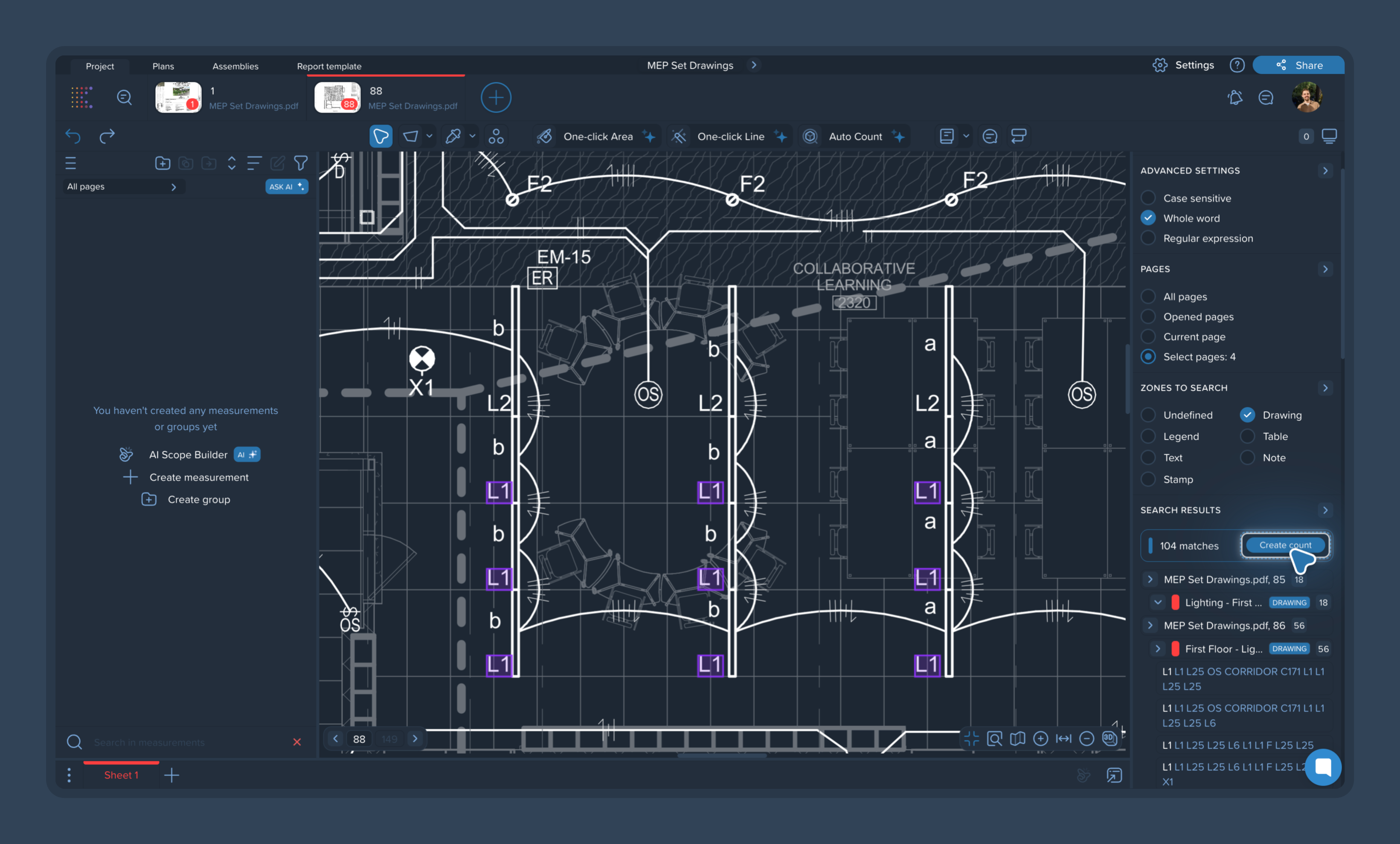 4) Create a count: To turn your search results into a measurable takeoff, simply click the blue Create count button next to the total match number. This will automatically generate a new count group for all the highlighted items.